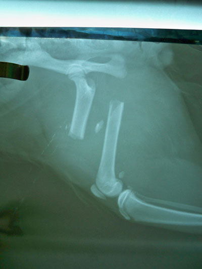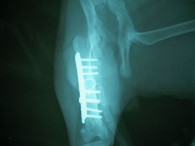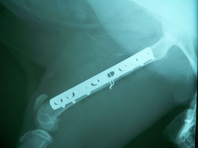 Γάτος ηλικίας 7 μηνών με κάταγμα μεσότητας διάφυσης μηριαίου οστού .Πραγματοποιήθηκε ορθοπεδικό χειρουργείο με μεταλική πλάκα κοχλίες και ορθοπεδικό σύρμα. Η αποκατάσταση ήταν 100% τα υλικά αφαιρέθηκαν 3 μήνες μετα .