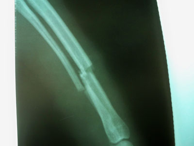Ημίαιμο καφέ σκυλάκι μεσαίου μεγέθους 3-4 ετών με ιστορικό ατυχήματος στις 30/01/10.Προσκομίσθηκε στο ιατρείο και διαπιστώθηκε κάταγμα στο δεξί πρόσθιο άκρο.Το κάταγμα ήταν τέλειο και εγκάρσιο στο κάτω /3 της διάφυσης της δεξιάς κερκίδας και ωλένης.