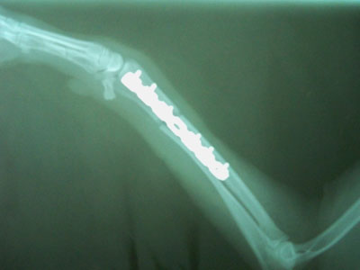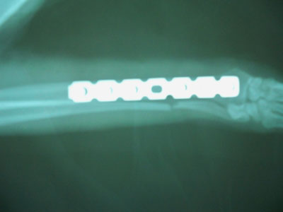Mετά την ανάταξη του κατάγματος τοποθετήθηκε μεταλλική πλάκα 2mm στην πρόσθια επιφάνεια της κερκίδας με 3 κοχλίες στο κεντρικό και 3 κοχλίες στο περιφερικό τμήμα.Συρραφή του μυ΄ι΄κού τοιχώματος έγινε με interlocking ραφή και του δέρματος με π ραφές.