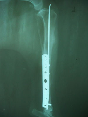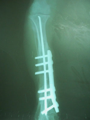 Κάταγμα στο κάτω τρίτο της διάφυσης της αριστερής κνήμης και τοποθέτηση στην έσω επιφάνεια μεταλλικής πλάκας με 3 κοχλίες στο άνω τμήμα και 3 κοχλίες στο κάτω.Επίσης τοποθετήθηκε ενδομυελικός ήλος.