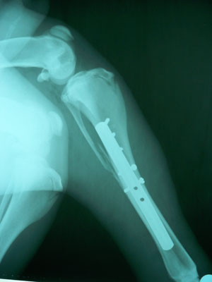 Μετά από την ανάταξη του κατάγματος τοποθετήθηκαν συμπιεστικά στην πρόσθια επιφάνεια 2 κοχλίες με σταυρωτή κεφαλή και στην έσω επιφάνεια τοποθετήθηκε μεταλλική πλάκα 3,5mm μήκους 14cm με 5 κοχλίες στο άνω καταγματικό άκρο και 4 στο κάτω άκρο.